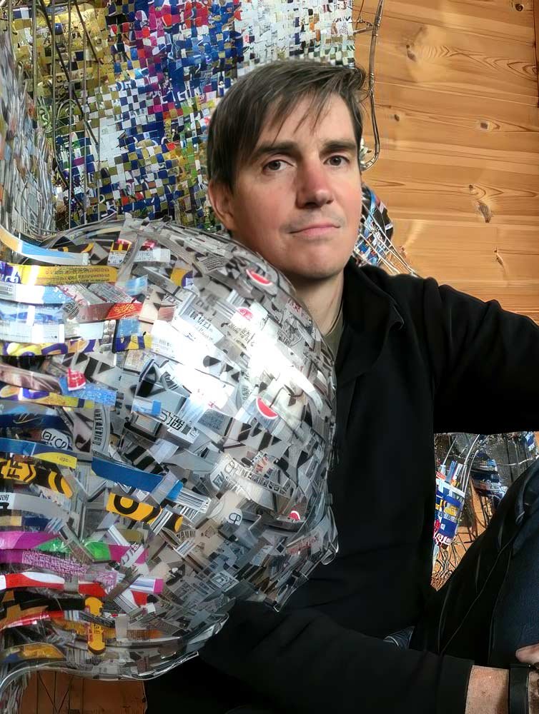 The artwork titled Zeus is a striking example of Jon Homewood’s innovative sculptural technique, utilizing woven strips of soda cans layered over a wire frame to create an evocative and powerful form. This bust, with its regal and somewhat imposing silhouette, echoes the grandeur of classical Greek statues, symbolizing power and divinity. The use of soda cans, however, introduces a contemporary twist that challenges traditional notions of sculpture and material.